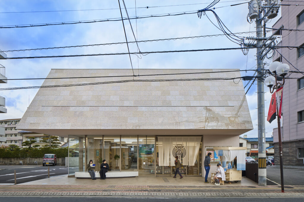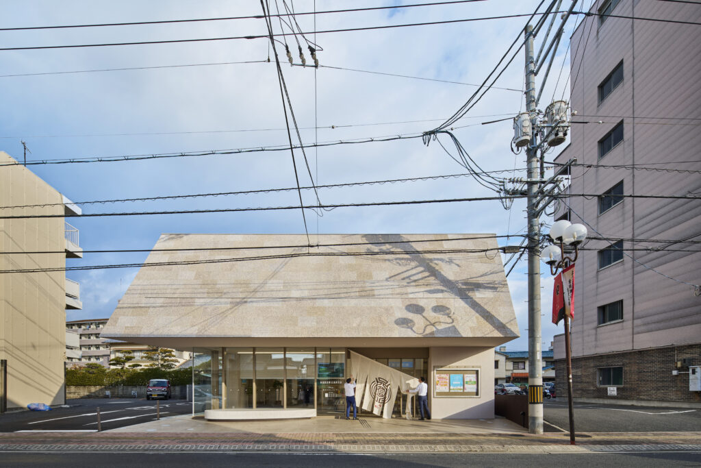 まず建物の配置は道路沿いにし、街にしっかりと“顔”を見せつつ利用客を迎えに行く姿勢とした。建物は2階までに低く抑え更に道路に面する2階の外壁を内側に傾斜させる。そうすることで歩行者に対し圧迫感を軽減させつつ、まるで地域の人々にそっと傘を差し出すようなあたたかい大庇へと視覚的に昇華させた。
