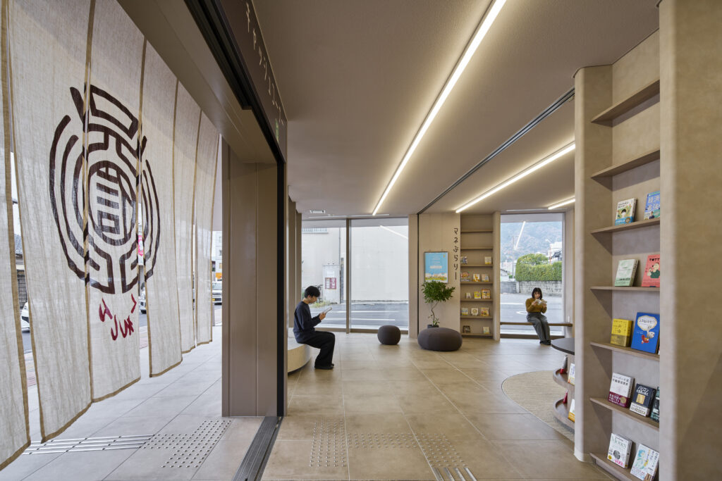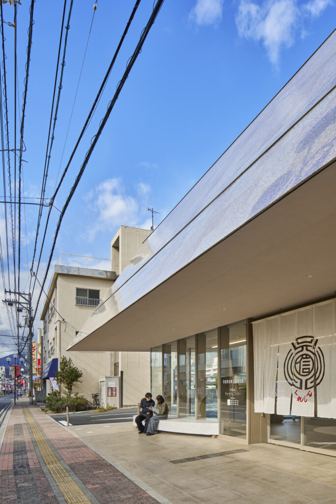 正面入口は中間期には開放したままにも出来る大開口とし、営業中はのれんを設えている。のれんには昔使われていた呉信用金庫の庫章を今回リバイバルして家紋のように採用し、100年間継承されてきた想いも込めた。