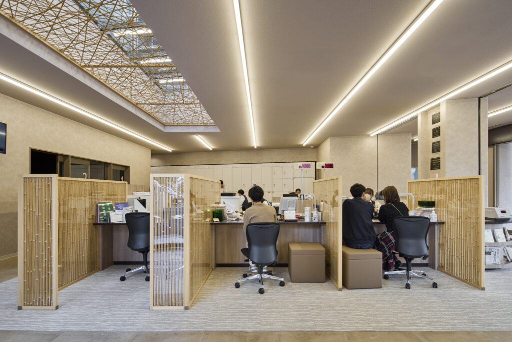 地域だけでなく環境にもやさしい施設を目指し、営業窓口の間仕切りや光天井等の家具の一部にCO2排出の無いカーボンニュートラルな竹材を採用した。庇下の小判形ベンチには呉で作られた竹チップが骨材として練り込まれており、街の景観としても表情豊かなスペースとなるように配慮した。